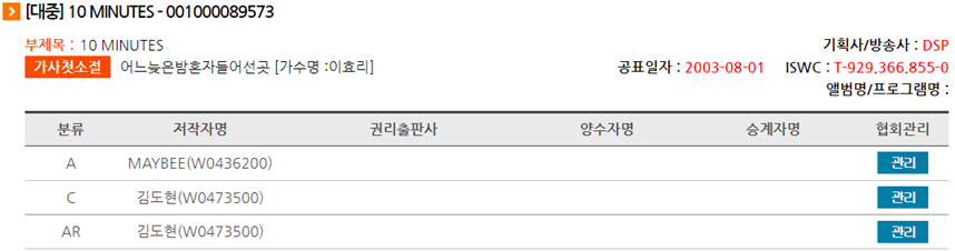 위 기사에서 원슈타인이 리메이크하는 가수 이효리씨의 '텐미닛(공식명 : 10 MINUTES)'은 (사)한국음악저작권협회에서 신탁받아 관리하고 있습니다. '텐미닛'은 'MAYBEE'씨가 작사하고 '김도현'씨가 작곡 및 편곡하여 저작자가 2인입니다.