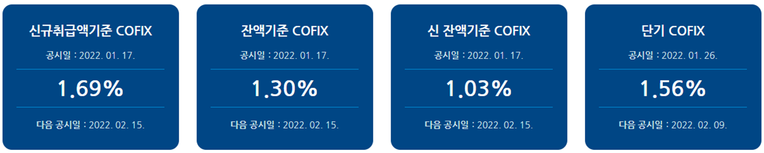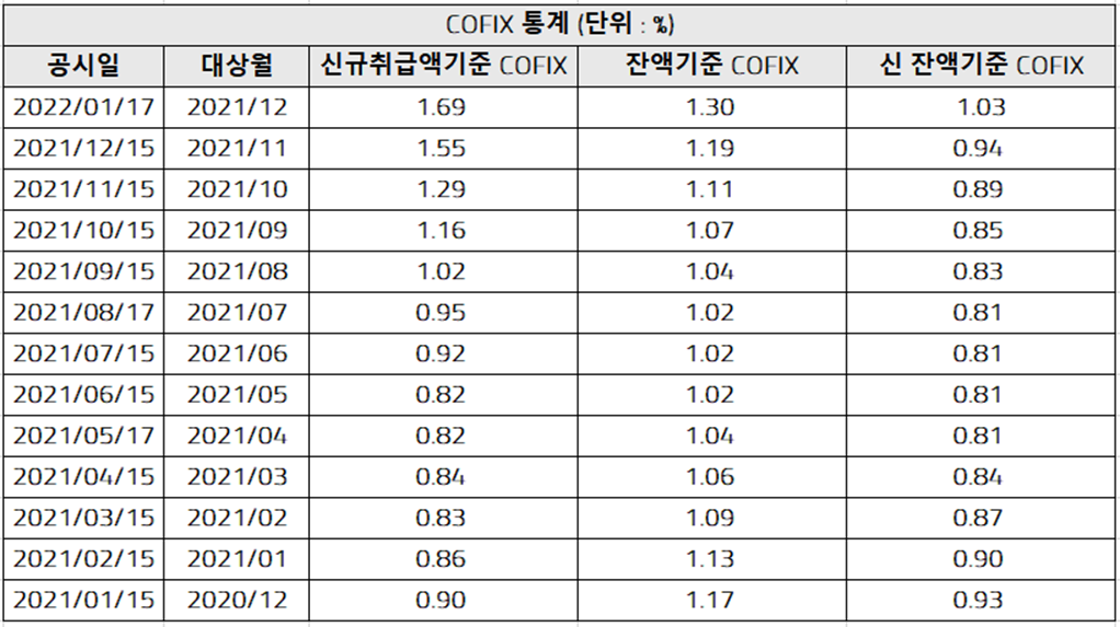 은행연합회는 지난 2022년 1월 17일에 COFIX 기준금리를 발표하였습니다. 은행연합회 사이트에 공시된 것은 아래와 같습니다(출처 : https://portal.kfb.or.kr/fingoods/cofix.php). 이에 따르면 신규취급금액기준 COFIX은 1.69%로 지난 2021년 12월 15일에 비해 0.14% 인상되었습니다.