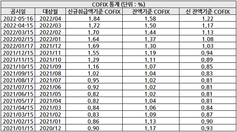 - 2022.04.15 4월 15일 자 COFIX 기준금리, 0.02% 인상