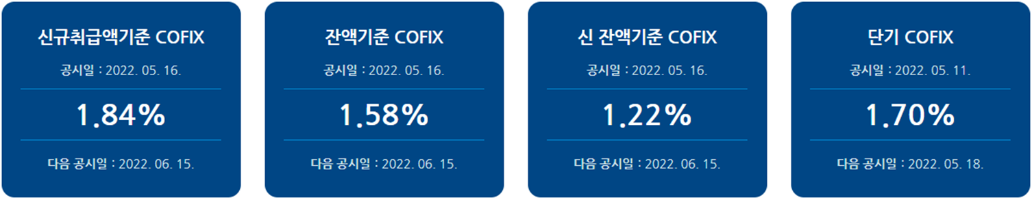 은행엽합회는 2022년 5월 16일에 COFIX 기준금리를 발표하였습니다. 은행연합회 사이트에 공시된 것은 아래와 같습니다(출처: https://portal.kfb.or.kr/fingoods/cofix.php), 이에 따르면 신규취급금액기준 COFIX는 1.84%로 지난 2022년 4월 15일에 비해 0.12% 인상되었습니다. 그리고 잔액기준 COFIX 및 신 잔액기준 COFIX의 경우도 각각 0.08%와 0.05% 인상되었습니다.