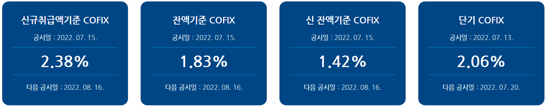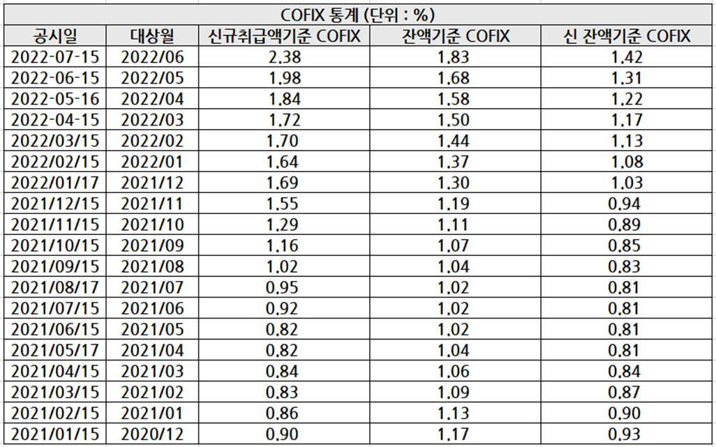 은행엽합회는 2022년 7월 15일에 COFIX 기준금리를 발표하였습니다. 은행연합회 사이트에 공시된 것은 아래와 같습니다(출처: https://portal.kfb.or.kr/fingoods/cofix.php), 이에 따르면 신규취급금액기준 COFIX는 2.38%로 지난 2022년 6월 15일에 비해 0.4% 인상되었습니다. 그리고 잔액기준 COFIX 및 신 잔액기준 COFIX의 경우도 각각 0.15%와 0.11% 인상되었습니다.